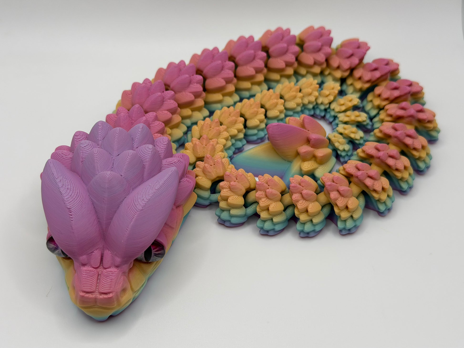 Custom 3D printed flexible snake in rainbow color. Each snake is crafted with glass eyes and each has a unique look. Snake is approximately 21 inches long.