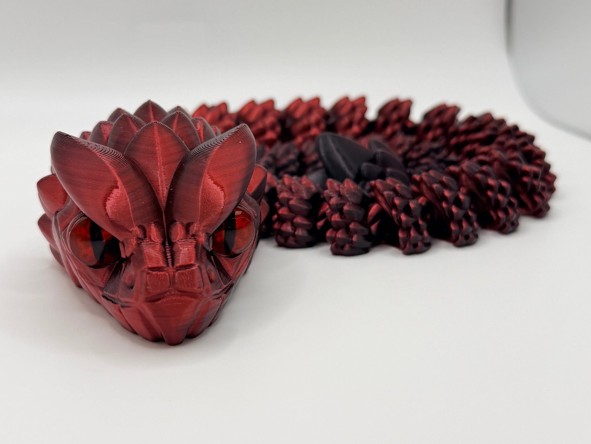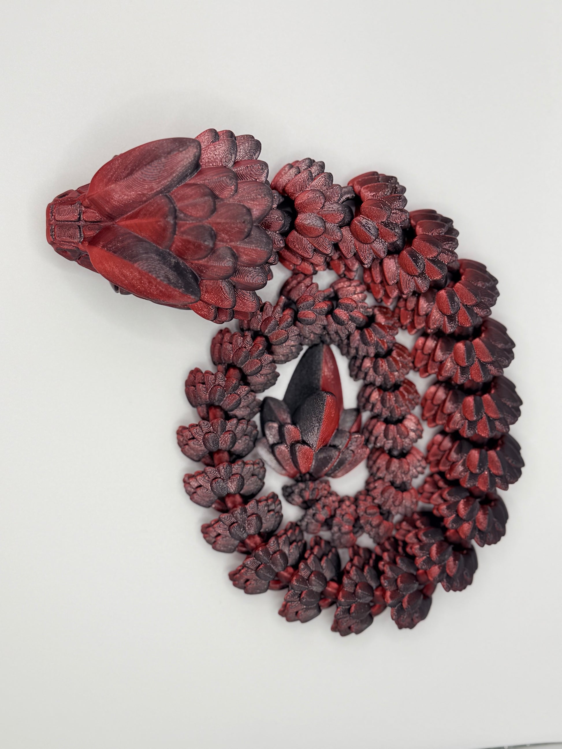 Custom 3D printed flexible snake in red/black dual color filament. Each snake is crafted with glass eyes and each has a unique look. Snake is approximately 21 inches long.